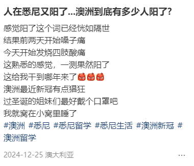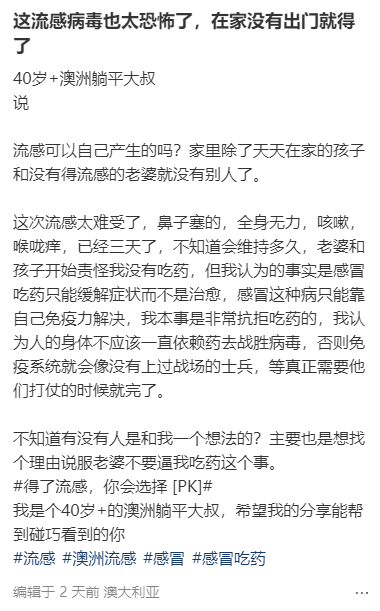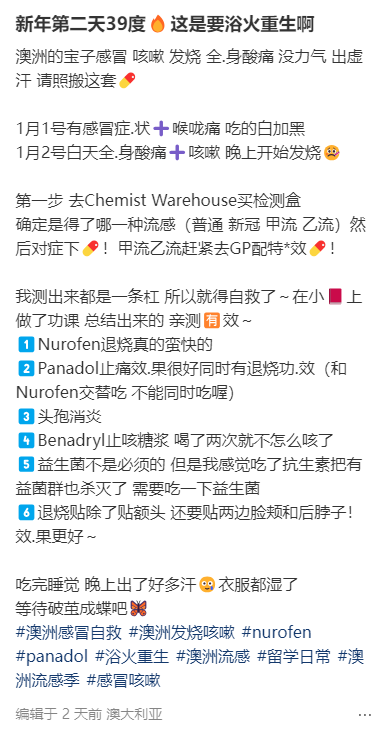 有人放完假就确诊甲流,今天还活蹦乱跳,隔天就喉咙不舒服,起初还以为是澳大利亚太干了,狂补水,结果一觉起来39.8度,直接烧到声音都没了。