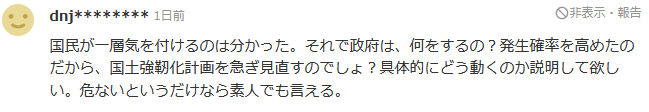 因为提高了发生概率,所以要赶紧重新审视国土强韧化计划吧?希望你能说明具体如何行动。如果只是说危险的话,即使是外行也可以说。