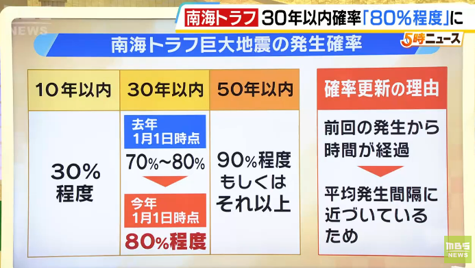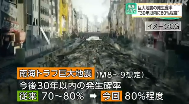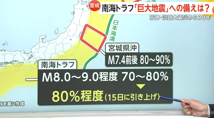 1月15日,日本地震调查委员会宣布,未来30年内,南海海槽发生8至9级特大地震的概率,从此前的“70%至80%”提高到了“80%左右”。