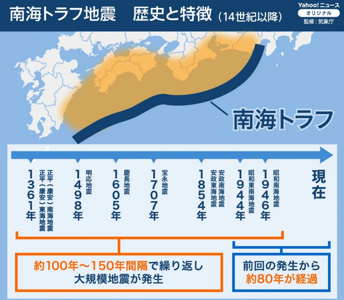 地震很难预测,但日本专家还是发现了规律:南海海槽大地震曾反复地震,大约每隔100年到150年就会发生一次。