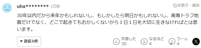 因为是30年以内,所以可能是明年,也许是明天。不仅是南海海沟地震,无论在哪里发生什么都不奇怪。所以,我认为必须珍惜每一天。