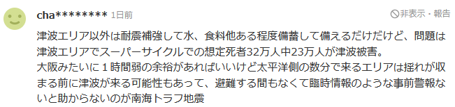 如果像大阪那样,有不到一个小时的缓冲时间就好了。但是太平洋一侧几分钟就到的区域,在地震停止之前就可能会发生海啸,没有避难的时间。如果没有临时信息之类的事前警报,就救不了南海海沟地震。