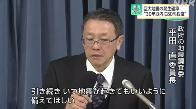 地震调查委员会的平田直委员长说:“用数字来表示的话,70~80%是80%,所以概率并不是直接上升了10%。但无论什么时候发生地震,都不会有什么不可思议的数字来提醒。还是希望大家继续做好准备。”