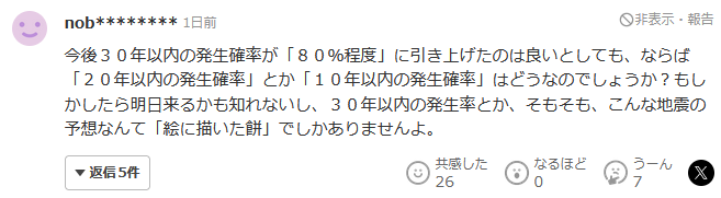 即使未来30年以内的发生概率提高到“80%左右”,那么“20年以内的发生概率”或“10年以内的发生概率”,又是怎样的呢?说不定明天就会来。30年内的发生率,原本这样的地震预测,就只是“画饼”。