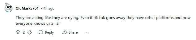 “这些人怎么表现得跟要死了一样?就算TikTok消失了,他们还有其他的平台啊,现在搞得每个人都知道你是个骗子,又有什么好处呢?”
