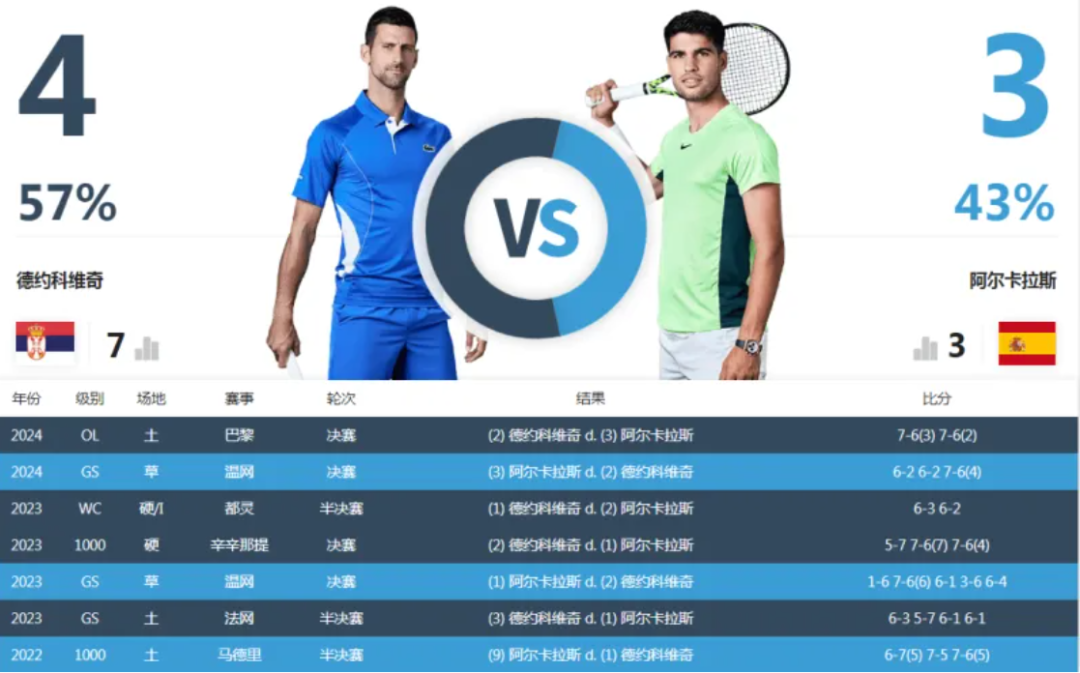 德约和阿尔卡拉斯此前一共交手过七次,最近一次交手是在去年的巴黎奥运会,当时德约在完全不被看好的情况下,通过双抢七绝杀了西班牙人,直接让阿尔卡拉斯泪洒罗兰加洛斯。时隔几个月后两人再次交手,最后能发生什么,自然让所有人都十分期待。