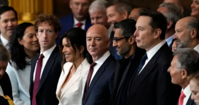 在举行典礼的美国国会大厦圆形大厅,网友们看到了一些科技亿万富翁,包括马克·扎克伯格、劳伦·桑切斯、杰夫·贝佐斯、桑达尔·皮查伊和埃隆·马斯克。