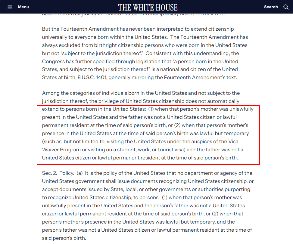 政令旨在改变美国宪法第14修正案的解释——任何在美国出生的婴儿,无论其父母的身份如何,都可自动获得美国公民身份。