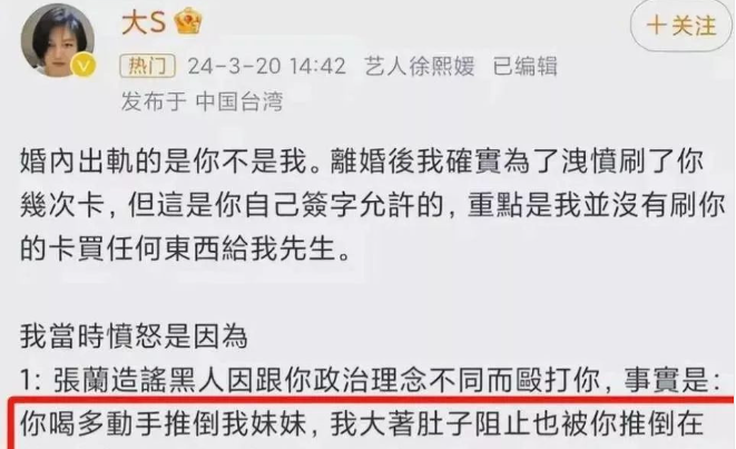 不少人就会想起大S曾经说过:汪小菲脾气暴躁,常常一言不合就开吵,怒火中烧,丝毫没有包容态度,甚至在她怀孕期间对其拳脚相加。