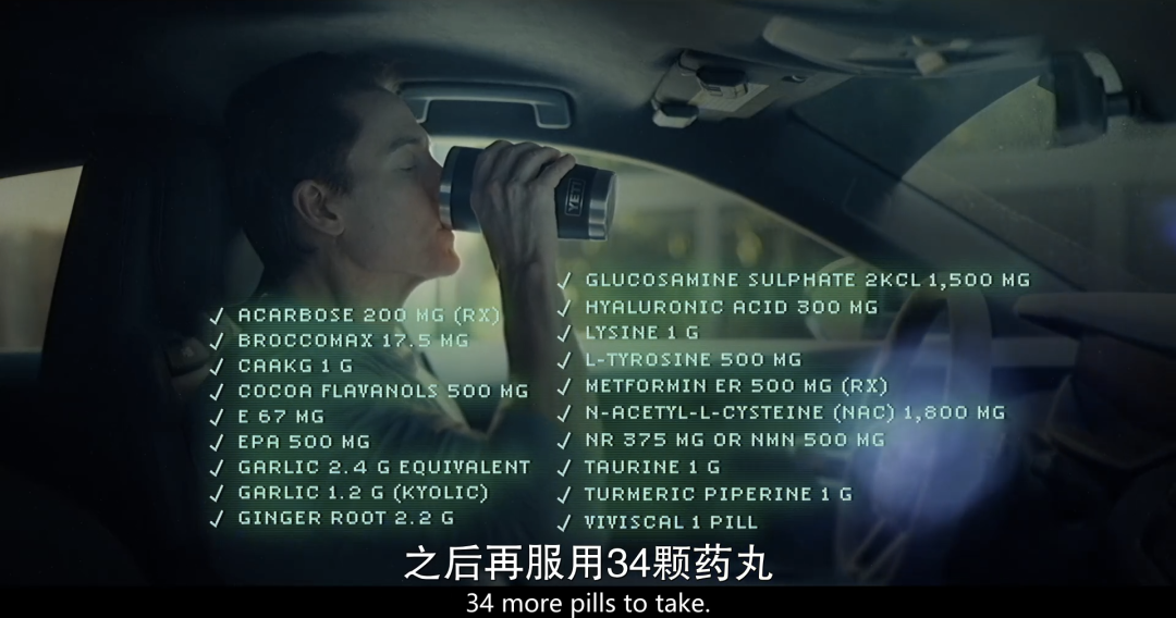 片中有这样一段:布莱恩对着镜头说,今天是“雷帕梅素日”,语气就好像一般人说今天应该去吃个什么新馆子。雷帕梅素其实是用来抑制器官移植排异反应的一种药,根据小白鼠的实验数据,它能延长寿命,但风险是会抑制免疫系统。尽管布莱恩的团队非常密切地监测他的身体反应,但观众仍然不禁要为这种“治疗”皱一下眉头。