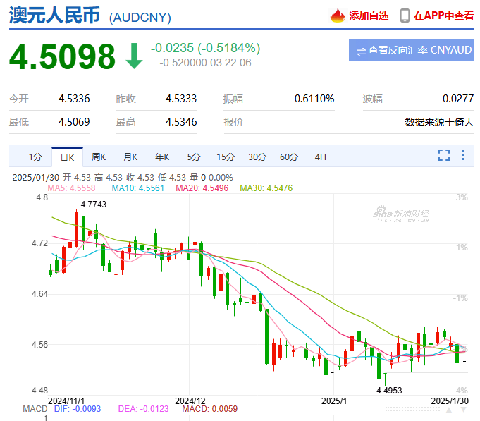 截至发稿,澳元兑美元为06227,澳元兑人民币也跌至4.50,最低达到4.49。