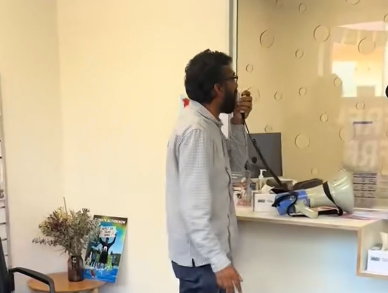 在一段公开发布的视频中,一名印度人直接闯进移民局,拿着话筒和喇叭站在服务窗口进行喊话,周围还有不少附和的声音。