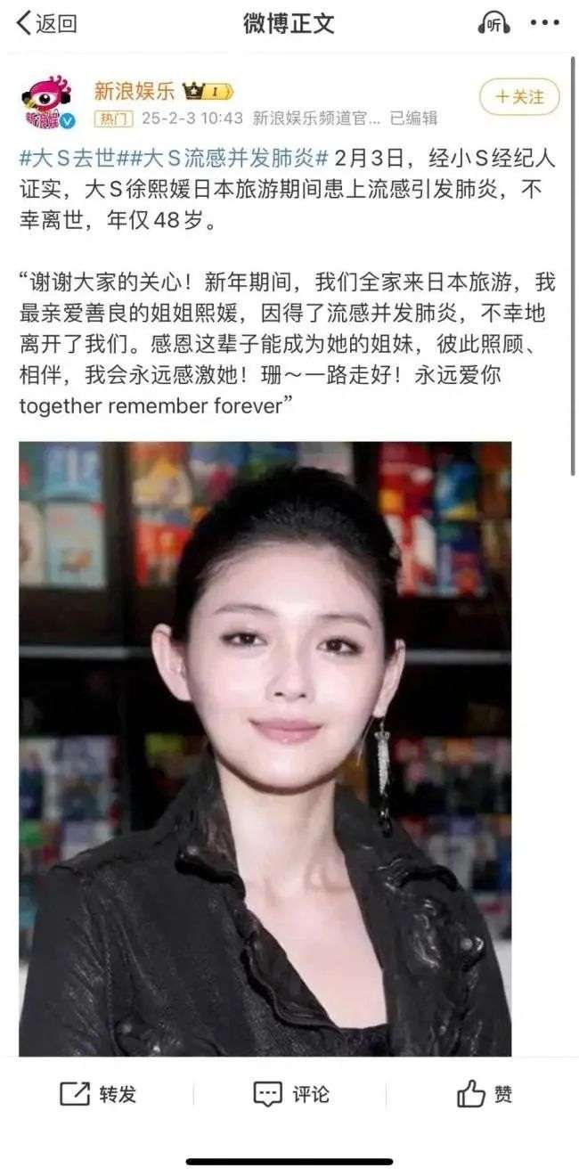 就在今天晚上,各大娱乐平台的一则新闻让大家震惊并心痛,大S徐熙媛于2月2日在日本由于流感引发肺炎不幸去世,享年48岁。