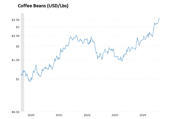 确实,咖啡价格在近年来出现了爆发式上涨。据国际咖啡组织(International Coffee Organization)数据显示,咖啡豆的价格在2022年的涨幅高达42%,到了2023年,最受欢迎的阿拉比卡咖啡豆(arabica coffee bean)价格已经逼近每公斤5美元(7.5澳元),比同期上涨36%。