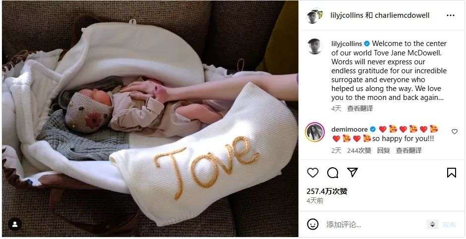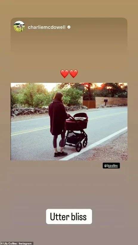12月31日,35岁女星莉莉·柯林斯(Lily Collins)和电影导演、制片人丈夫查理·麦克道威尔(Charlie McDowell)在Instagram上发帖,兴奋地宣布他们的第一个孩子出生了。