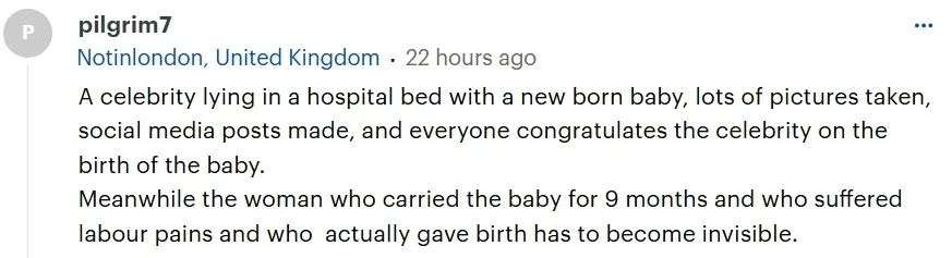 有网友总结说:“一个名人躺在医院的病床上,怀里是一个刚出生的婴儿,拍了好多照片,在社媒上发了好多帖子,每个人都祝这位名人刚生了孩子。