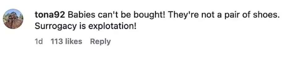 有网友评论:“人们通过代孕当爹当妈,然后在医院的病床上跟新生儿合影,这有点奇怪。完全没必要。他们本可以发孩子在摇篮里的照片。”