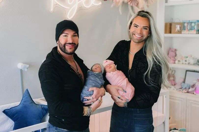 去年5月,在Ins上有16万+粉丝的美国发型师约瑟夫·瑞安·韦恩(Joseph Ryan Wayne)和丈夫通过代孕,喜提一对龙凤胎。