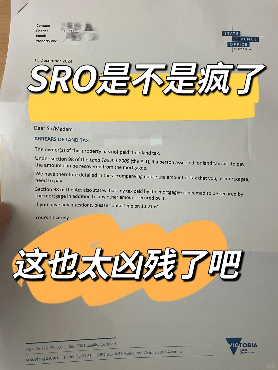 最近,这位投资者突然收到银行的通知,发现银行在未提前联系或征求他授权的情况下,直接将所有欠缴的地税及高额罚金共计6万多澳元,直接计入他的贷款,并划款给州税务局(SRO)。