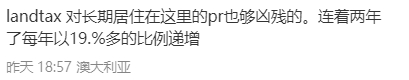 另一位在澳网友称,澳洲地税对于长期居住在这里的pr也够凶残的,连着两年了每年以19%多的比例递增。