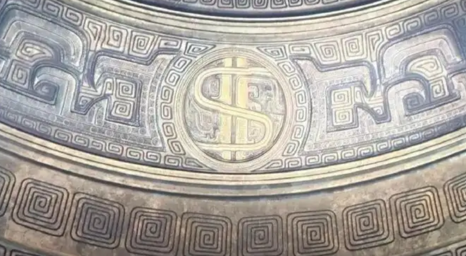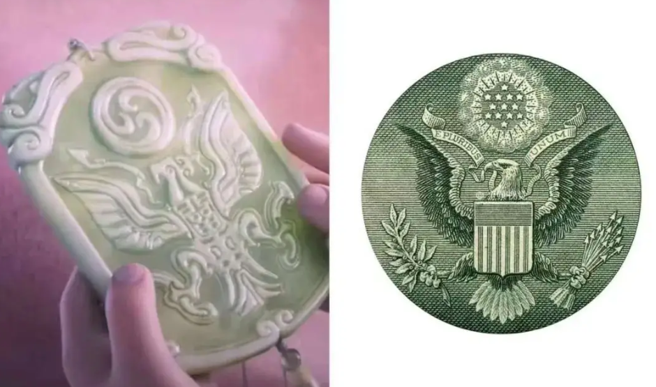 通过升仙考试,哪吒拿到的神仙牌是绿色的,上面印有老鹰的标志,也和美国绿卡不谋而合;炼丹的天元鼎上印有和“美元$”极其相似的符号;