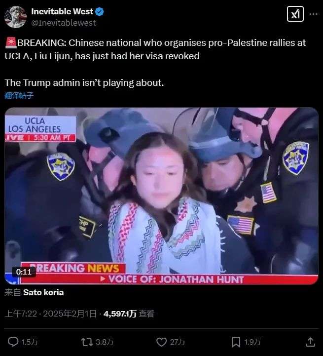 2月1日,该账户发布了一段视频,视频中一位女生被警方逮捕,文案表示这名女生是UCLA在读中国留学生刘丽君,因为组织了亲巴勒斯坦抗议活动而被吊销签证。截止至本周三中午,该帖子的阅读量已达到了4597.1万。