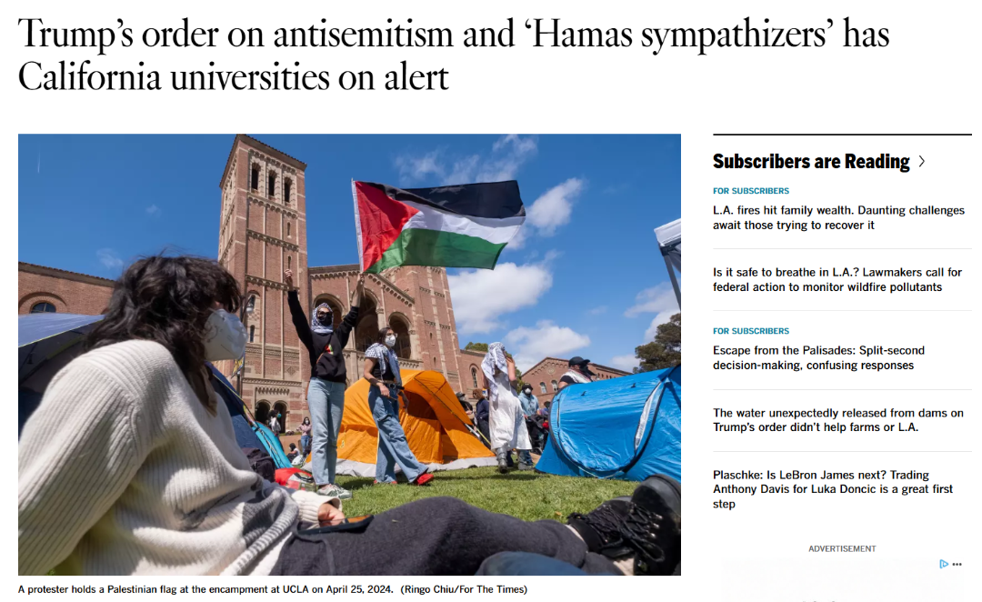 特朗普曾发布过一项行政命令,要求联邦政府严厉打击校园反犹太主义,并威胁取消亲巴勒斯坦国际学生的签证,呼吁联邦政府“起诉、驱逐或者以其他方式追究校园内非法反犹太骚扰和暴力行为的实施者的责任”。