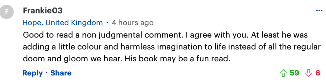 “很高兴看到一条不带任何评判的评论。我同意你的观点。至少他为生活增添了一点色彩和无害的想象力,而不是我们经常听到的那些悲观和沮丧。他的书读起来可能很有趣。”