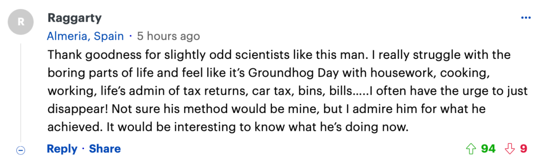 “感谢上帝有像这位先生这样有点古怪的科学家。我真的很难忍受生活中无聊的部分,感觉就像土拨鼠日一样,做家务、做饭、工作、生活中的纳税申报、汽车税、垃圾箱、账单......我经常有消失的冲动!