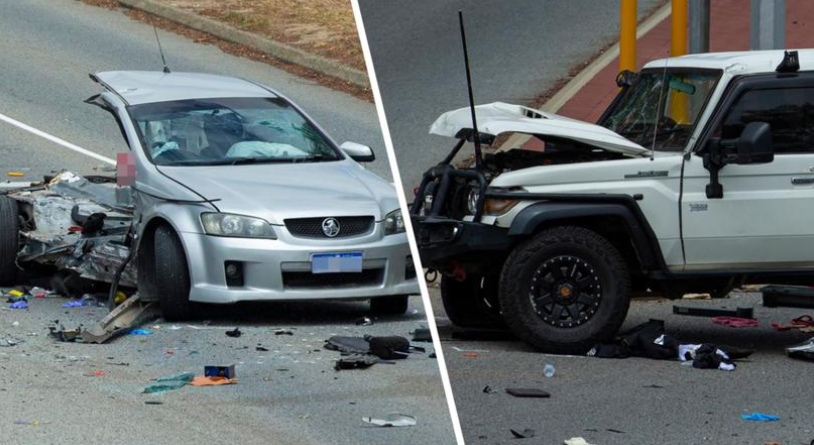 Holden Commodore的车身上部似乎在货斗处被撞成两半,而丰田车的引擎盖受损,道路上散落着残骸,包括一辆滑板车、睡袋和衣物。