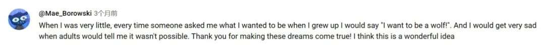 “在我很小的时候,每次有人问我长大后想做什么,我都会说:‘我想做一只狼!’大人们告诉我这不可能的时候,我非常伤心。感谢你让这些梦想成真!我觉得这个主意棒极了。”