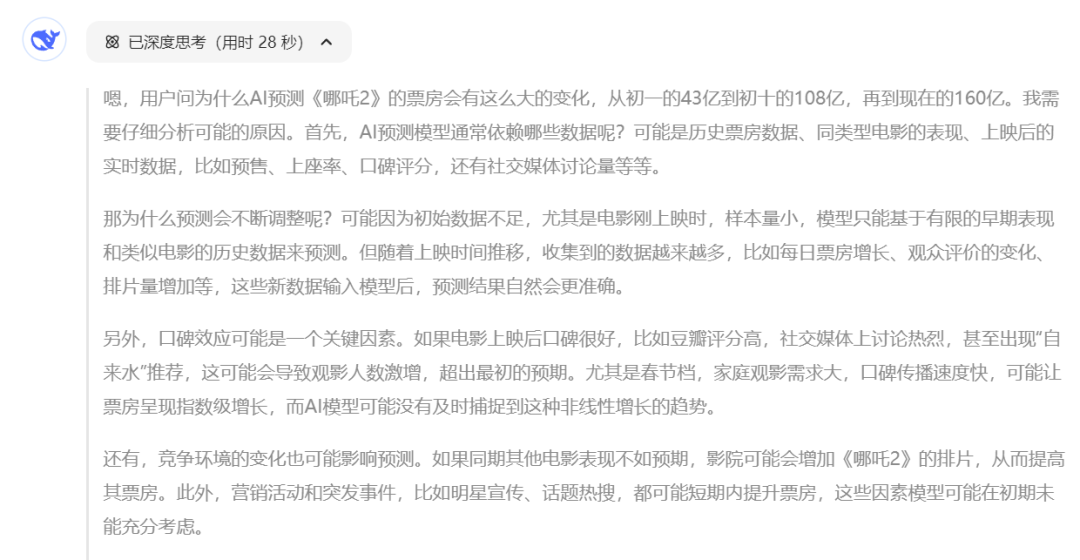 DeepSeek总结称,《哪吒2》票房预测修正幅度达272%(43亿→160亿元),反映出超级IP在档期内的非线性增长特性。建议预测模型在后续版本中强化社交情绪分析和竞品弹性系数模块,以提升对现象级爆款的早期识别能力。