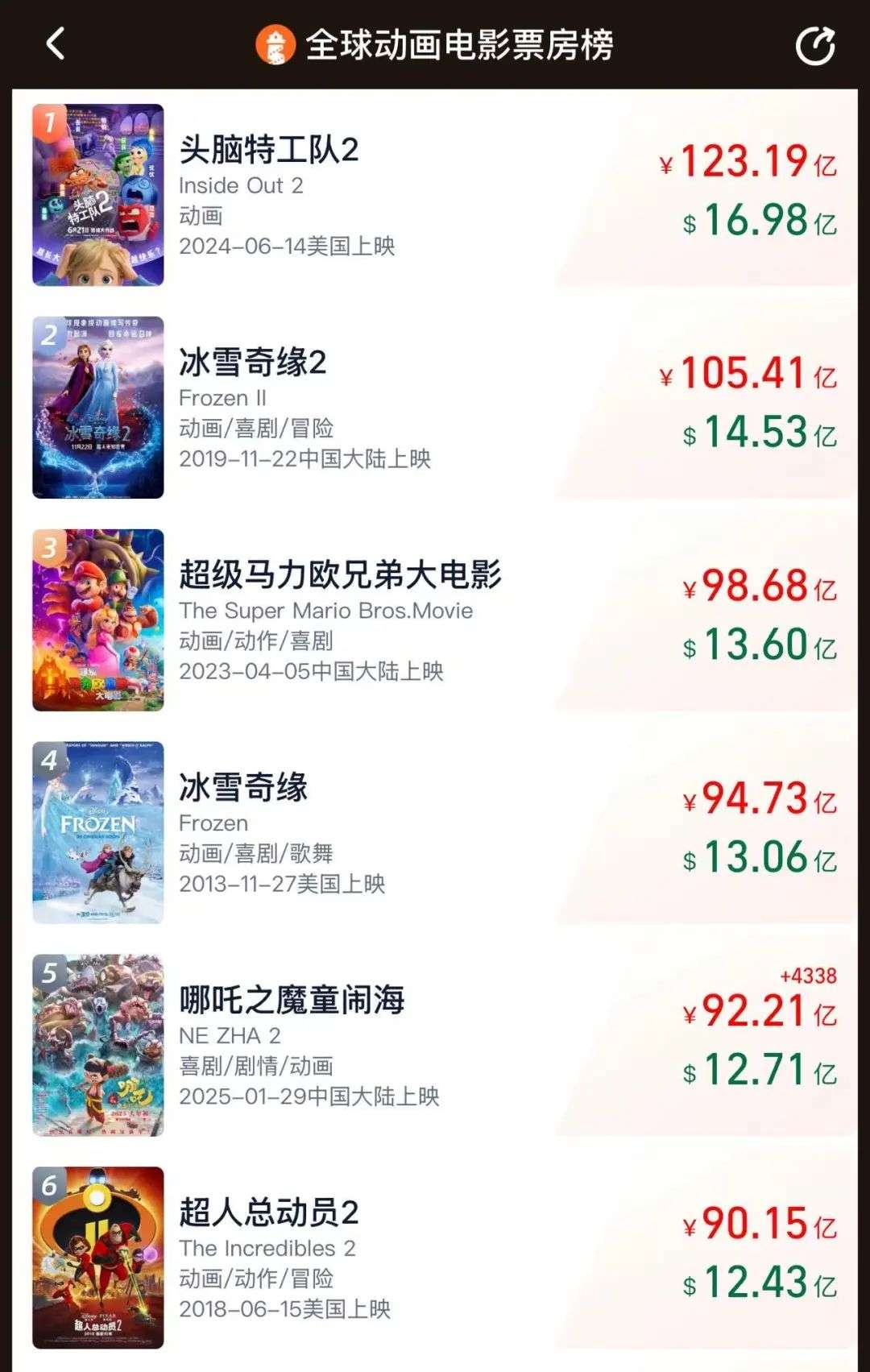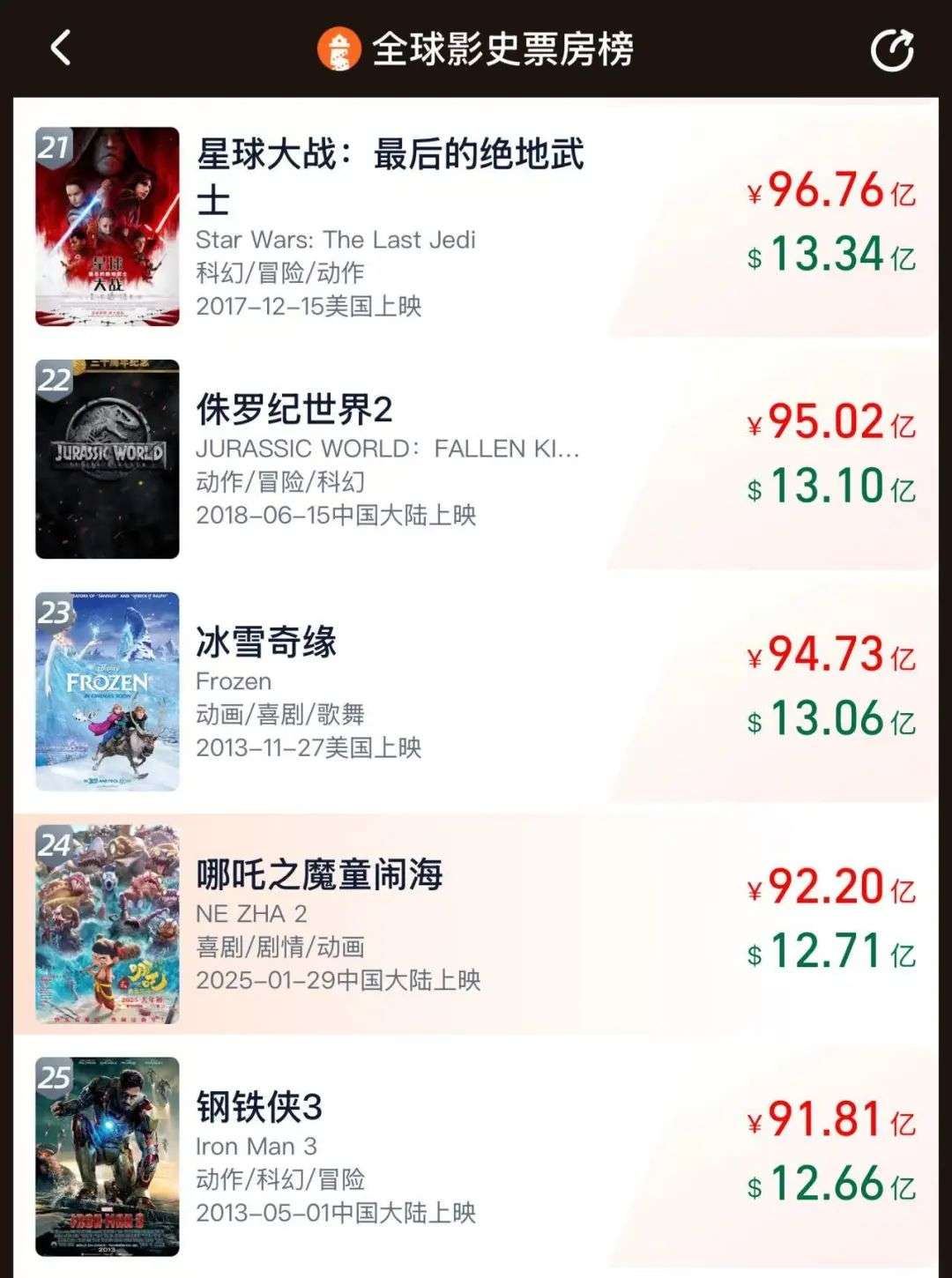 目前,猫眼专业版给《哪吒2》的预测票房已经超过160亿元。如果成真,《哪吒2》将以绝对优势登顶全球动画电影票房榜,并且将力压《星球大战:原力觉醒》位列全球电影票房榜第5名,前面仅剩总票房164.23亿元的《泰坦尼克号》、168.25亿元的《阿凡达2》、202.99亿元的《复仇者联盟4》以及212亿元的《阿凡达》。