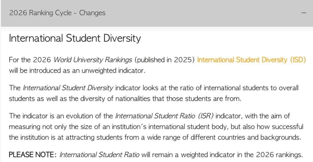 国际学生多样性(ISD)将作为非加权新指标被加入其中。