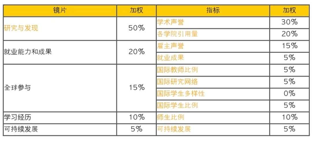 引入了可持续发展、就业能力以及国际研究网络,调整了此前学术声誉、雇主声誉以及师生比三大指标。