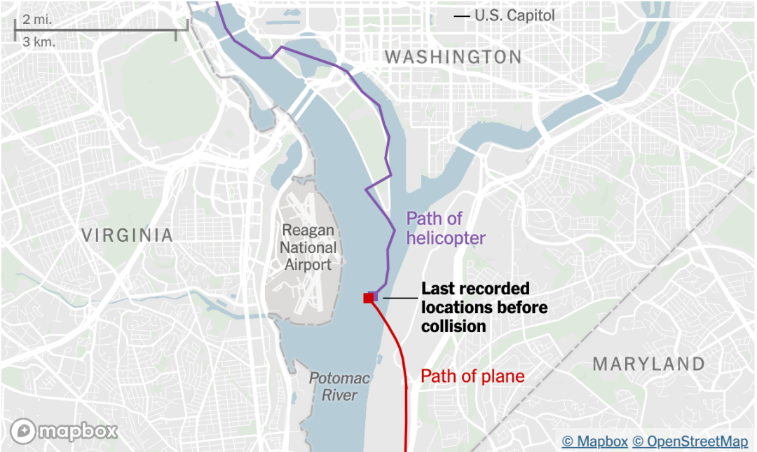 2月2日,官方发布的声明落下了最后一音,67名遇难者的遗体已经全部被找到。时间回溯到那个周三,当地时间晚上8点48分,美国航空公司5342号航班与一架军用黑鹰直升机在里根国家机场附近空中相撞,导致两架飞机坠入波托马克河,地点距离白宫大约5公里。客机上的60名乘客和4名机组人员,及直升机上的3名机组成员,无一生还。这是自2001年911事件以来,美国最严重的一场空难。