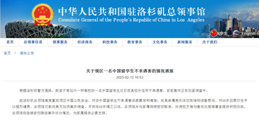 中华人民共和国驻洛杉矶总领事馆2月13日亦发布了通报,称驻洛杉矶总领馆高度重视领区中国公民安全,对该中国留学生不幸遇害深感震惊和痛惜,向其亲属表示深切哀悼和诚挚慰问,对凶手犯罪行径予以强烈谴责。总领馆已敦促美方加快案件调查,尽快将凶手绳之以法。总领馆并与家属保持密切联系,协调校方等为善后处理等事宜提供积极协助。总领馆将继续密切跟进案件侦办情况,为家属提供必要支持。