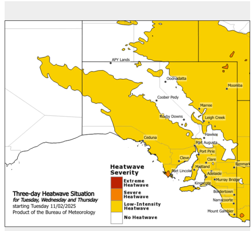 气象局发布了严重热浪预警,同时,CFS首席官员Brett Loughlin表示,该州西海岸、东海岸和lower Eyre Peninsula以及Mount Lofty Ranges将实施全面禁火。