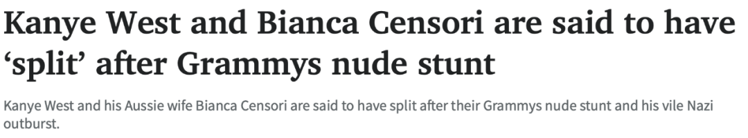 这场婚姻的破裂其实早有端倪。不久前,Bianca在格莱美红毯上仿佛“全裸”引发争议,但YouTube网红Riley Mae Lewis爆料称,她曾听到侃爷和Bianca在后台争吵。