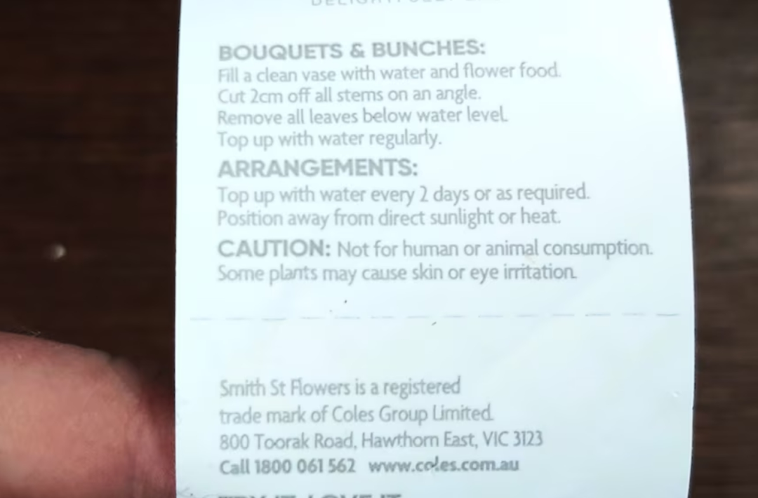 尽管三年前Coles超市曾标注花束的产地,但如今仅在内包装上提示“不可食用,可能引起皮肤或眼睛刺激”,Woolworths也采用了类似的警告标签,并未注明具体原因。
