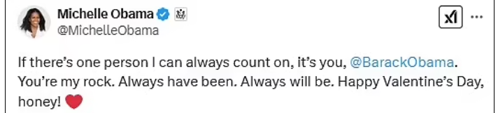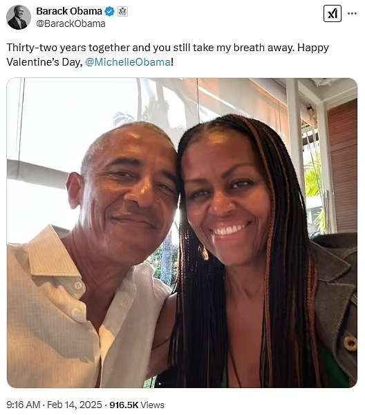 “32年相伴,你依然让我心跳加速。情人节快乐,米歇尔·奥巴马!” 这位民主党前总统周五在X(原推特)上深情写道。