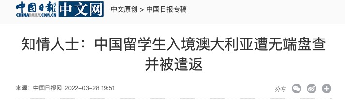 一位消息人士表示,在这事一个月前,另一名中国赴澳留学生在悉尼国际机场入境时遭澳边境执法人员无端盘查,后被遣返。
