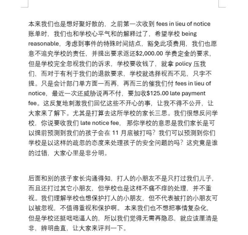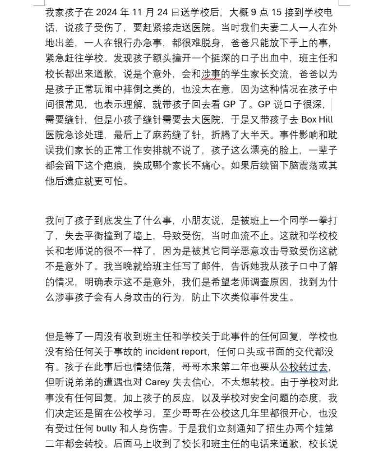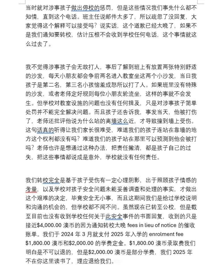 新学年,孩子已转至公校。截至目前,也没有收到任何前学校关于那次安全事件的书面回复。收到的只是接近4000澳元的账单,因为家长太晚才通知学校要转校而收的。
