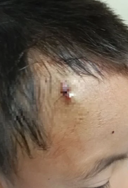 早间妈妈把孩子送到学校后,接到学校电话,说孩子受伤要接走送医院。爸爸只能放下受伤的事赶到学校。发现孩子额头有一个挺深的口子、还在出血。
