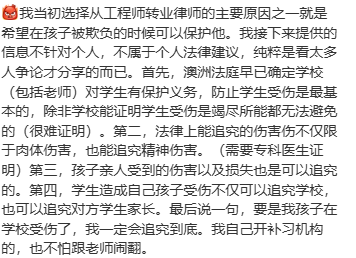 我当初选择从工程师转业律师的主要原因之一,就是希望在孩子被欺负的时候可以保护他。我接下来提供的信息不针对个人,不属于个人法律建议,纯粹是看太多人争论才分享的而已。首先,澳洲法庭早已确定学校(包括老师)对学生有保护义务,防止学生受伤是最基本的,除非学校能证明学生受伤是竭尽所能都无法避免的(很难证明)。第二,法律上能追究的伤害伤不仅限于肉体伤害,也能追究精神伤害。(需要专科医生证明)第三,孩子亲人受到的伤害以及损失也是可以追究的。第四,学生造成自己孩子受伤不仅可以追究学校,也可以追究对方学生家长。最后说一句,要是我孩子在学校受伤了,我一定会追究到底。我自己开补习机构的,也不怕跟老师闹翻。