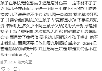 孩子在学校无论是被打、还是意外伤害,一定不能不了了之。我儿子在childcare被一个阿三小孩不小心推倒,脑袋撞破,儿子说是他不小心,幼儿园一直道歉,我也就咬牙忍了、 并要求他们时刻关注孩子。毕竟都是小孩,下手没深没浅,结果没过多久那个阿三孩子又给我儿子推倒,牙磕到椅子上流了很多血。这次我忍无可忍,明确跟幼儿园院长交涉,而且发了律师信,要求幼儿园把这个孩子哄走。他不走我们走,而且还要把他们曝光到报纸,后来childcare把管理他俩的阿姨开除,并且把阿三哄走,哄走我们也不在那个childcare呆了。