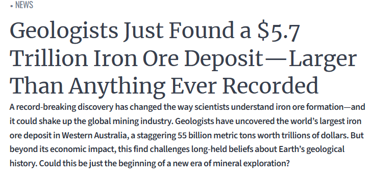 澳洲是怎么突然暴富的?原来就在最近,地址学家在澳洲发现了迄今为止全球规模最大的铁矿床,这个铁矿床的保守估算价值为5.775万亿美金,按照现在的汇率计算就是9.15万亿澳币!