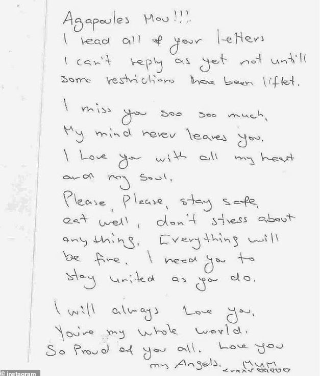 去年7月,Voulgaris仍在狱中时,女儿Maria在社媒上分享了一封妈妈写给孩子们的手写信: