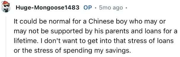 彩礼可能对于中国男孩来说是正常的,但自己是不想因为这个花掉自己的积蓄,甚至都背上“彩礼贷”,给自己搞上那么多的压力。