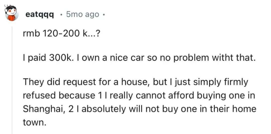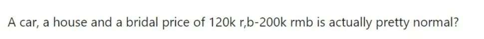 有网友觉得一辆车、一套房再加上12万到20万人民币的彩礼,其实...算挺正常的。